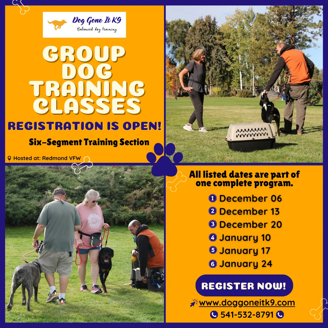 🐾 Join our Group Dog Training Classes: a structured six-segment training section designed to build reliable obedience and better manners your dog can use every day.